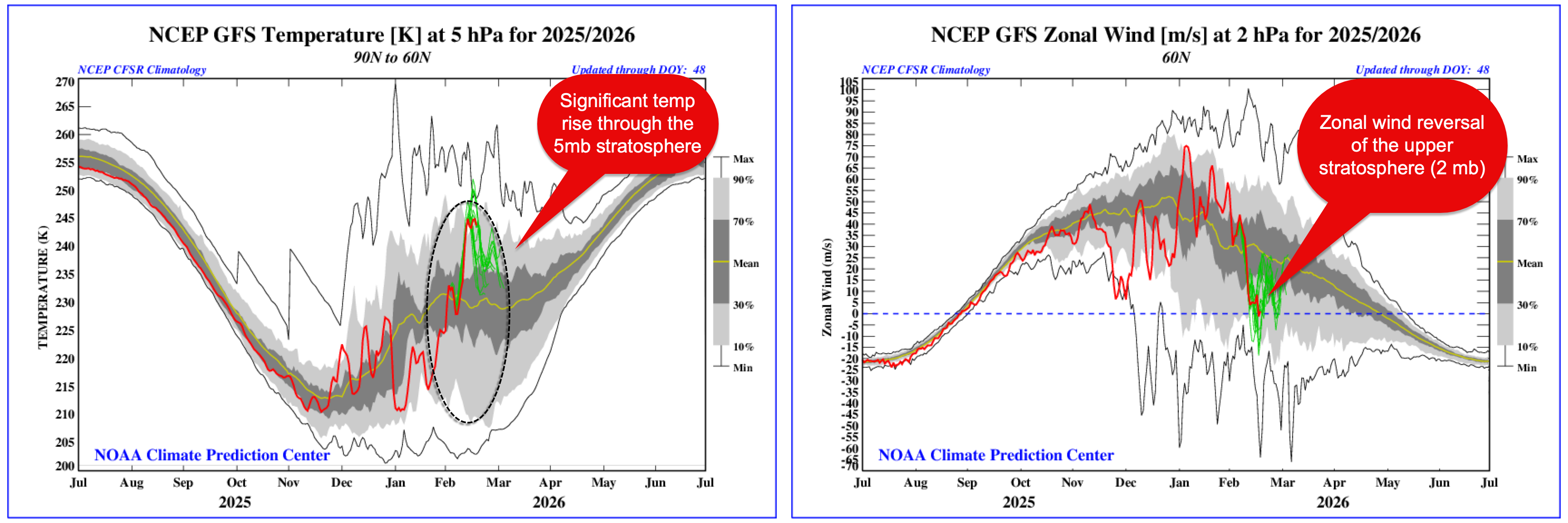 In this case, the initial trigger was an extreme warming event in the upper troposphere observed in late January. That tropospheric amplification has propagated upward, with the upper stratosphere responding over the past fortnight. We are now seeing a marked temperature rise through the 5 hPa layer and a reversal of zonal winds near 2 hPa (figure below), clear evidence that the vortex has been significantly weakened aloft. The disturbance is most pronounced in the upper levels for now, but the structure beneath is beginning to respond.