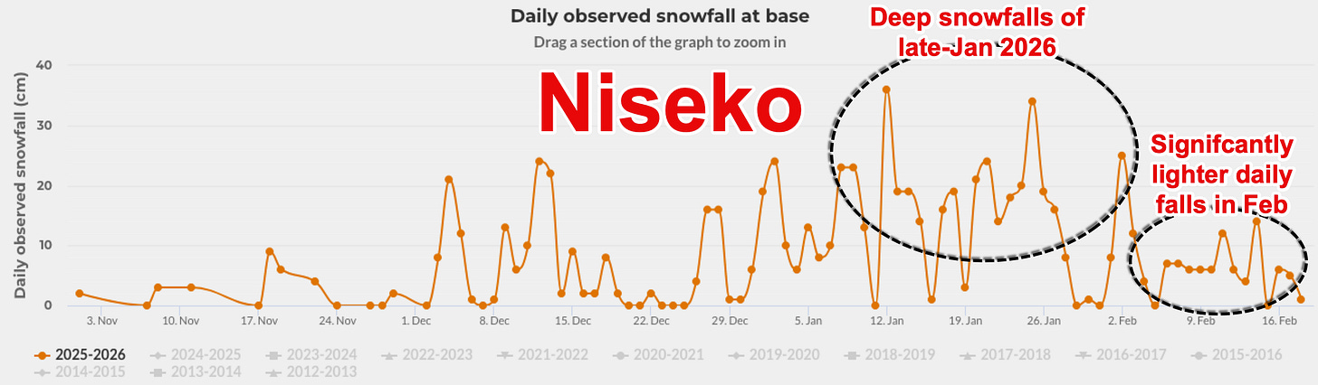 The pattern shift proposed back in early February has verified, and we’ve seen a flip in hemispheric conditions over the past week, where Western North-America, Europe have seen extraordinary snowfall and heightened avi-risk over the past week. Conversely, across Japan, we’ve seen an abrupt abatement in the extraordinary snowfall event in the second-half of January.